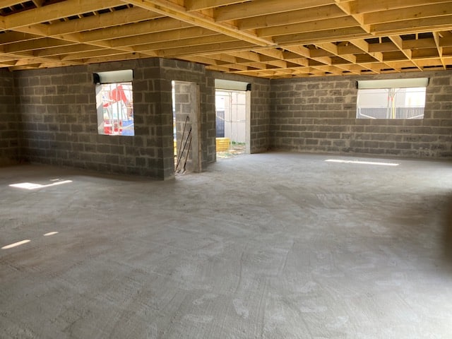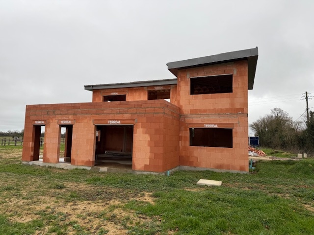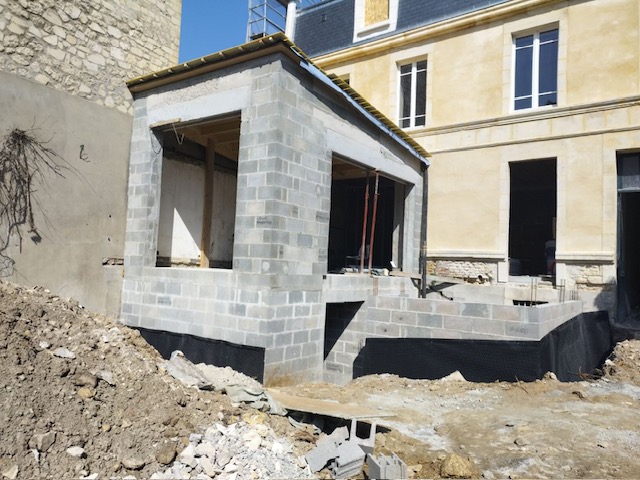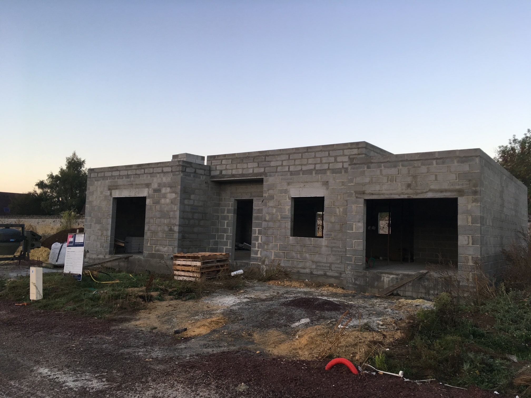 Cette photo illustre l’avancement d’un projet de construction neuve, dont les murs en briques sont entièrement montés. La structure révèle déjà les volumes généreux et l’architecture contemporaine de la future habitation.